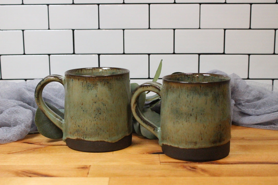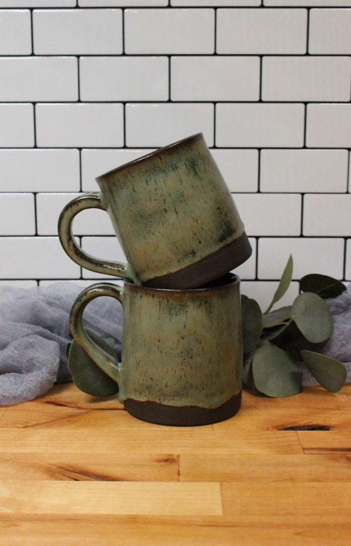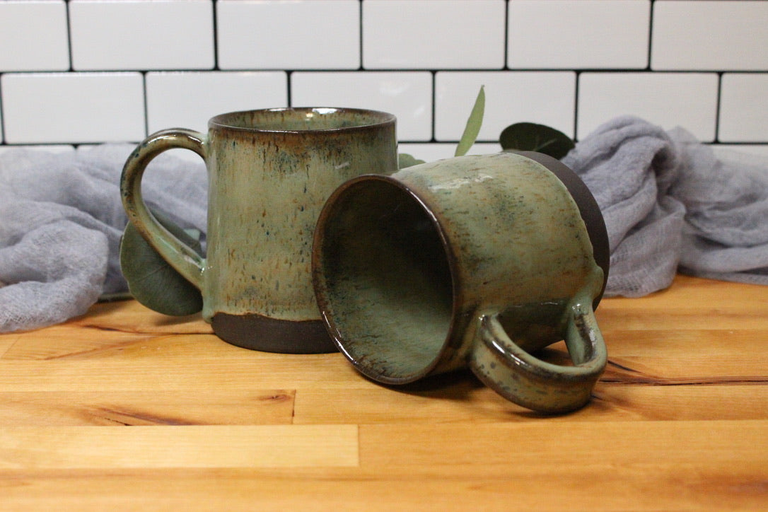 All of our mugs are handcrafted, wheel thrown from high quality stoneware clay. Our mugs consist of hand-pulled handles that contribute to the uniqueness and character of each mug. After their final firing, our hand glazed mugs are now dishwasher, microwave and oven safe!