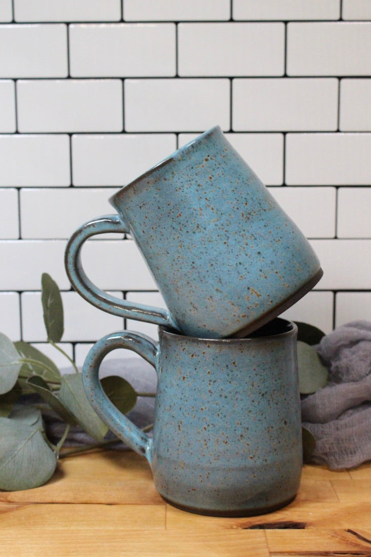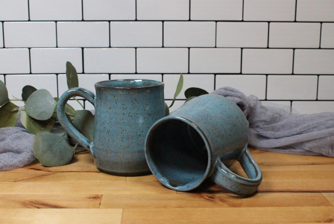 All of our mugs are handcrafted, wheel thrown from high quality stoneware clay. Our mugs consist of hand-pulled handles that contribute to the uniqueness and character of each mug. After their final firing, our hand glazed mugs are now dishwasher, microwave and oven safe!