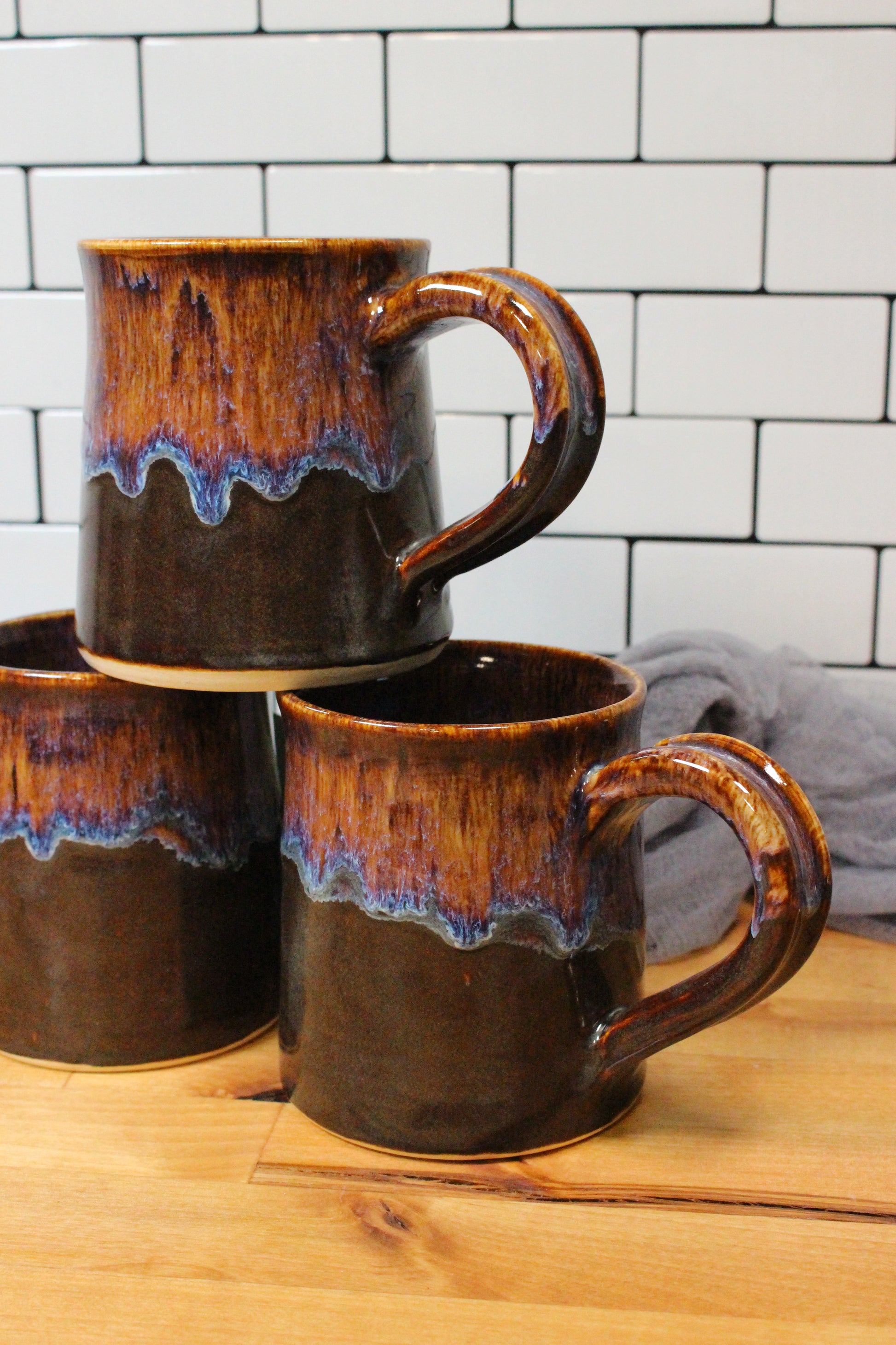 All of our mugs are handcrafted, wheel thrown from high quality stoneware clay. Our mugs consist of hand-pulled handles that contribute to the uniqueness and character of each mug. After their final firing, our hand glazed mugs are now dishwasher, microwave and oven safe!