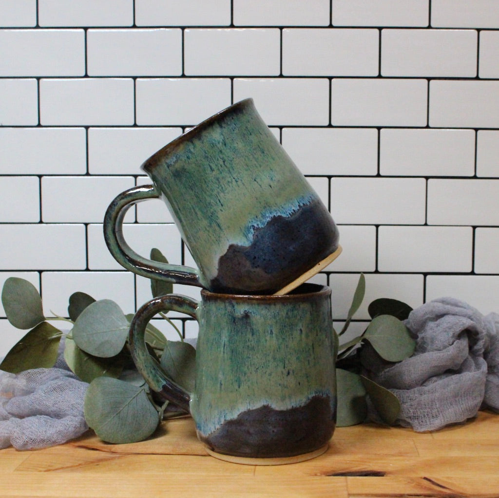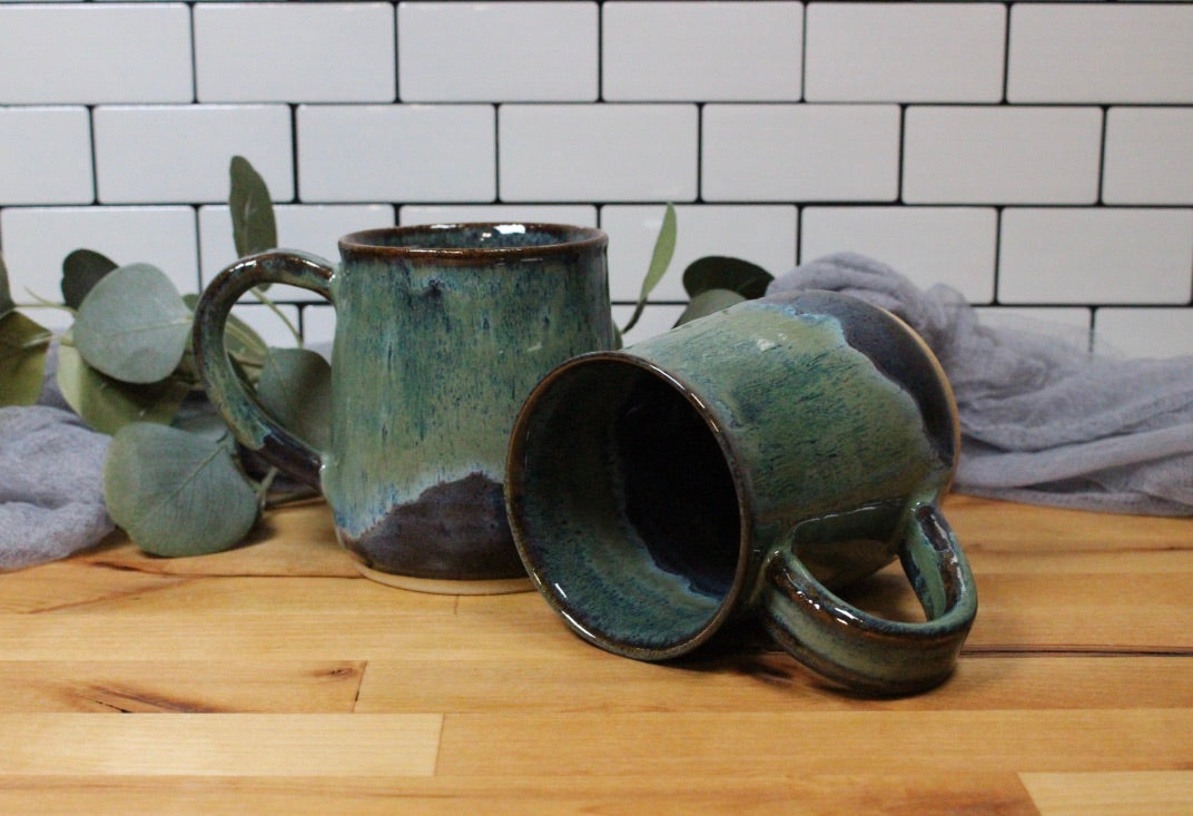 All of our mugs are handcrafted, wheel thrown from high quality stoneware clay. Our mugs consist of hand-pulled handles that contribute to the uniqueness and character of each mug. After their final firing, our hand glazed mugs are now dishwasher, microwave and oven safe!